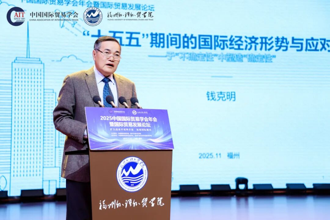 主论坛环节,全国政协常委、商务部原副部长钱克明,中国社会科学院经济研究所原所长裴长洪,对外经济贸易大学原副校长林桂军,教育部长江学者、厦门大学出版社社长彭水军,中国国际贸易学会兼职副会长、福州外语外贸学院副校长黄建忠等五位嘉宾,分别就《“十五五”期间的国际经济形势与应对——于“不确定性”中塑造“确定性”》《制度型开放:中国与世界的双向互动》《特朗普“对等关税”的效应》《FTA网络深化的全球价值链稳定器作用》《“十五五”:大国博弈与开放经济》,做精彩演讲。